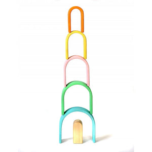 The stunning Pastel Wooden Arches Stacker from Bumbu Toys is oh so pretty and super versatile. A beautiful rainbow of soft blue, aqua green, pale pink, yellow, orange and natural timber, the Arch Stacker can be used by itself to create tunnels or towers or in combination with other blocks to form windows, doors, and turrets.