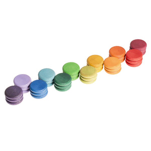 Made from natural timber with water-based colour stain, Grapat Coins feel beautiful in the hand and are fantastic for sensory play. This set shows off Grapat's beautiful rainbow colours, which match nicely with the rainbow colourways of similar wooden toy brands.