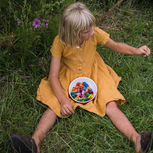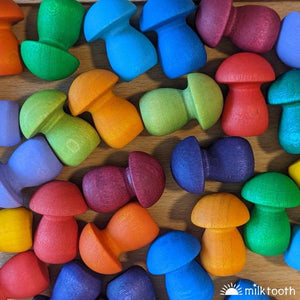 The Grapat Mandala wooden toys sets provide a truly endless source of play. Your child can combine the beautiful rainbow coloured 36 piece Little Mushrooms set with some of the other Mandala sets, or play with it on its own. She or he can colour sort and colour match, create amazing patterns, invent sorting games, counting games, and more. The Grapat Mandala sets can also be used as tokens in other games and are wonderful for developing fine motor skills. The Grapat Rainbow Mushrooms include three mushrooms in each of 12 different colours.