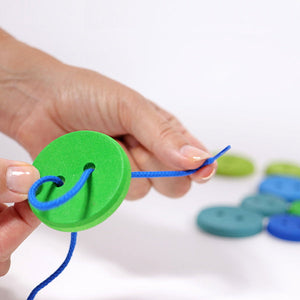 A set of 24 rainbow wooden buttons in two sizes to enhance your child's play. You'll also receive two cords for threading. Also use them as currency, for sorting, stacking and counting, with Grimm's Rings, Friends, Mushrooms, Balls, and Forests.