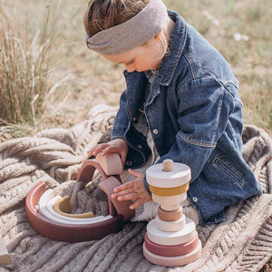 The Marsala SABO Concept Stacking Rainbow features pink, mauve, wine/maroon, mustard, beige, milk chocolate, and natural timber arches. An absolutely striking piece that would look beautiful in any nursery or playroom and is instantly appealing to little hands.