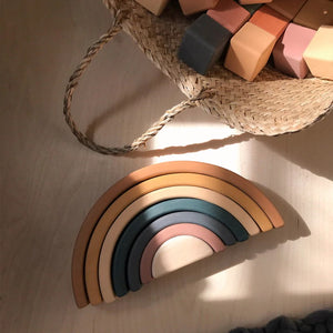 SABO Concept Rainbow Stackers comprise seven arches of gorgeous linden wood, stained in beautiful earthy colours. Each arch has rounded edges and corners and a velvety tactile matte feel, meaning they stack and balance easily.
