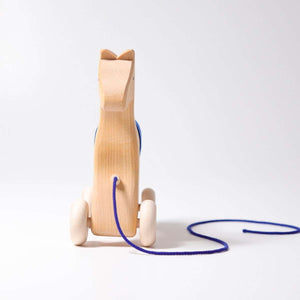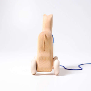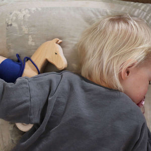 The absolutely lovely Grimm's Holly Horse is made from beautiful natural lime wood, with a little cotton tail. Holly has a vibrant blue felt saddle, carefully handpainted eyes, a sturdy wheel base, and a cord to pull her along the floor. This is a wonderful toy for small children who have just learnt to walk.