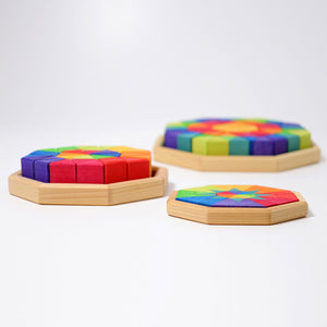 The beautiful Grimm's Spiel Und Holz Small Octagon is the smallest of all of the Grimm's Octagons. It includes 32 triangular wooden blocks stained in gorgeous bright colours. The blocks form the most amazing mandala array.