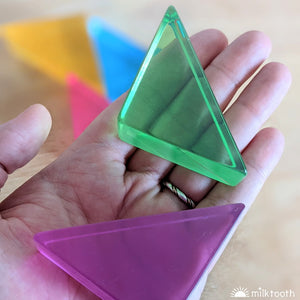 Papoose Large Lucite Triangles are big isosceles triangle blocks in six different jewel bright colours. You'll receive one of each colour. Simply beautiful and satisfying to play with - children will love to stack them, create mandala patterns, and form squares, rectangles, and other shapes.