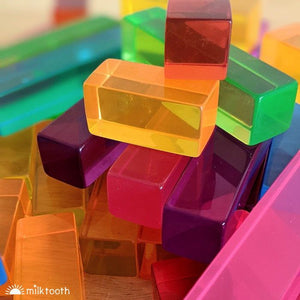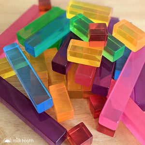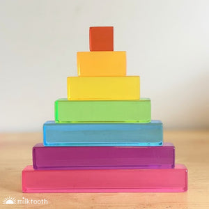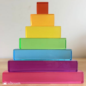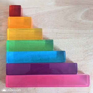 Papoose Lucite Stepped Rods are beautiful, appealing, fun, and educational. Their transparency invites children to play with light and colour. They can stack the rods and join them together, compare lengths and use a ruler to measure each one.