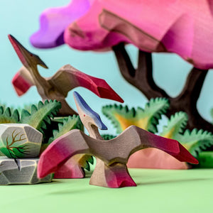 The elegant, swooping Bumbu Toys Pteranodon features bright splashes of fuchsia pink and deep blue on its wings, head, and tail. A graceful giant of the skies, the Pteranodon was much larger than its cousin, the Pterodactyl, and lived in the late Cretaceous period. A beautiful addition to the Bumbu Toys Dinosaurs range
