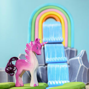 Our Bumbu Toys Pink Baby Unicorn has been carefully handcarved and handpainted in gorgeous detail, including a beautiful horn with metallic silver detailing, an ombre of fuchsia pink, and intricate silver markings along her mane, on her hooves, and on her graceful face. Our Bumbu Unicorn is finished with a lovely pink twine tail.