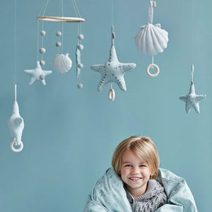 A dreamy underwater piece, the Cam Cam Copenhagen Ocean Mobile features a shell, a starfish, seawood and little round balls in soft organic cotton and dreamy ocean blue colours.