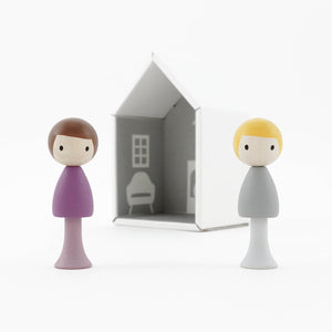 Luca and Tom are a blond and brown-haired pair of CLiCQUES boys, with handpainted purple and grey outfits. Their facial features are deliberately kept minimal to keep these beautiful wooden toys open-ended and ready for your child's imagination.