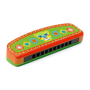 This colourful, happy Wooden Animambo Harmonica for Kids by Djeco is a perfect first musical instrument for a child. Anyone can "play" a harmonica! It has been painted in bright colours using non-toxic paint, with a gorgeous leopard or tiger face as the main feature.
