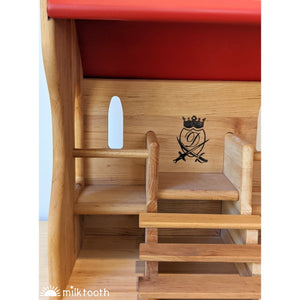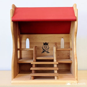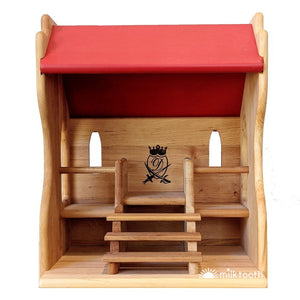 The detail on Drewart's Knight's Tournament Stand is gorgeous. The steps leading up to the King or Queen's seat are beautifully finished, and the stylised D symbol printed on the back wall gives the piece a truly royal touch. The walls of the stand are stepped on either side where they meet the beautifully painted red roof. The Knight's Stand features two windows in the back wall and a window on each side wall, all of which are arched. Let the jousting begin!