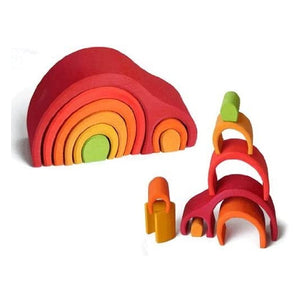 Gluckskafer's Arch House Red is a wooden stacking toy that combines vibrant red, orange, yellow, and green with eight stacking pieces to form a double arch.