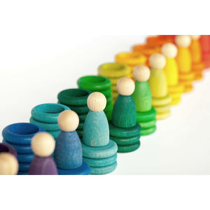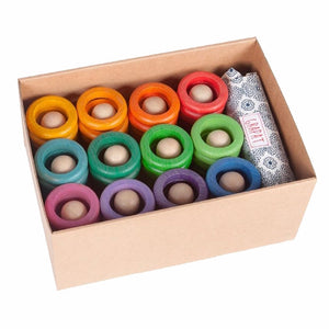 Made from natural timber with water-based colour stain, the Nins Carla feel beautiful in the hand and are fantastic for sensory play as well. Children can hide their Nin peg dolls using six Rings stacked up high; add a matching or contrasting Coin as a base and a lid. They can also stack three Coins together to make a platform for each Nin.
