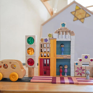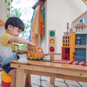 Our timber Grimm's Spiel & Holz vehicles are perfect for playing in, amongst, and along Grimm's rainbows, pebbles, people, and bridges. They also combine extremely well with our lovely Waytoplay road tracks. The wheels on the bus move to allow for fantastic zoomy fun!