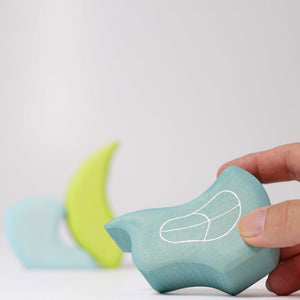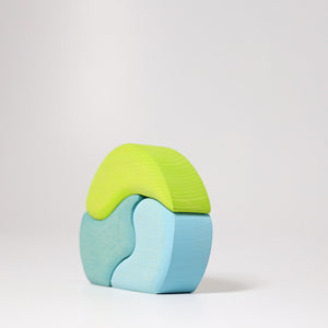The Grimm's Gnome Bungalow comprises three wooden pieces in lovely light blue, aqua, and green and organic shapes, finished off with handpainted silvery designs. The three blocks stack together to form the sweetest little home, but you can also use them in combination with other Grimm's toys to add curves, doors, and windows.