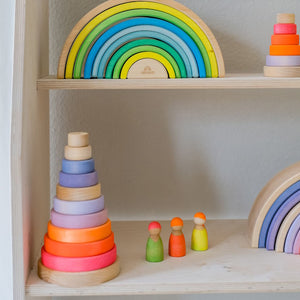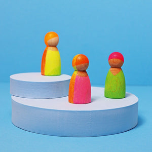 The vibrant and beautiful Grimm's Neon Mix Friends are a stunning blend of neon pinks and greens alongside calming natural timber. These bright little friends are sure to become firm favourites in the playroom. Use them in a doll house or with your Grimm's Rainbows and Pebbles to create imaginative play scenes.