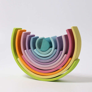 The already gorgeous Grimm's Spiel und Holz Large Wooden Rainbow is now even prettier in this stunning Pastel version. Soft blues, purples, pinks, orange, yellow and green all come together to form this beauty. Just as versatile as the original iconic Grimm's Rainbow, the Large Pastel Tunnel sits pretty in a nursery or kid's room and can be stacked as a rainbow, splayed out, used as a bridge, used as a tunnel for cars (and even little people!), the possibilities are endless.