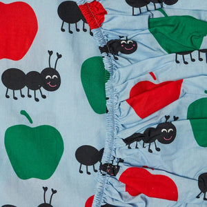 The Ants Pants Cot Fitted Sheet from Aussie designers Kip & Co features wonderfully vibrant and colourful red and green apples alongside cheeky blank ants against a soft blue background.