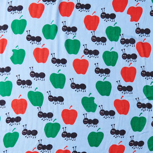 The cheerful Ants Pants Bamboo Baby Swaddle from Kip and Co features wonderfully vibrant and colourful red and green apples alongside cheeky blank ants against a soft blue background.