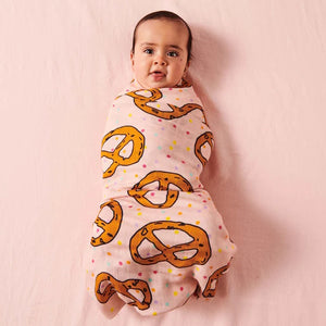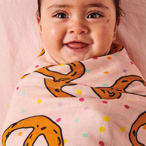 A must have for new babies and mummas. Kip and Co 100% bamboo swaddles are super soft and perfectly sized for bundling up baby. Swaddles help keep little ones snug and secure, and are a handy light layer for on the go. These swaddles are also an excellent comforter to last through those baby years! The Pretzels Pink Bamboo Swaddle features one of Kip and Co's most loved and playful prints with hand drawn pretzels on a pink base with multicoloured sprinkles.