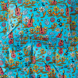 The Kip and Co x Lee McConnell Peace Out print features psychedelic guitars, musical notes, peace signs, and singing daisies on a vibrant blue base. It has a plain blue reverse and a button closure at base. Choose from Single and King Single/Double quilt covers.