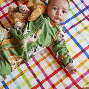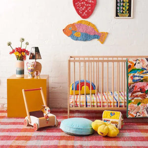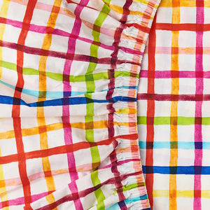 The bright and happy Kip and Co Picnic Check Organic Cotton Fitted Sheet in Cot or Bassinet size features a rainbow multicoloured check pattern on a white base.This sheet is made from 100% GOTS certified organic cotton, making it a socially responsible product, better for you, baby, and the planet.