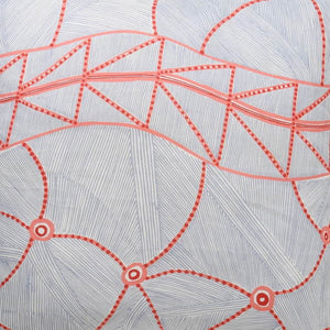The artwork has two stories. First, it shows the kinds of mini-cyclones common during the wet season in Arnhem Land. Secondly, Kunkurra relates specifically to a site called Bilwoyinj, near Mankorlod, on Janet’s husband’s clan estate. At this site, two of the most important Kuninjku creation beings, a father and son known as nakorrkko, are believed to have hunted and eaten a goanna. They left some of the goanna fat behind at the site, which turned into the rock that still stands there today.