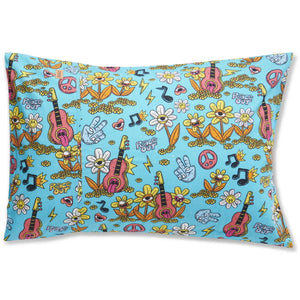 The Kip and Co x Lee McConnell Peace Out print features psychedelic guitars, musical notes, peace signs, and singing daisies on a vibrant blue base. Choose from a single Pillow Case (1P) or a pair of Pillow Cases (2P).
