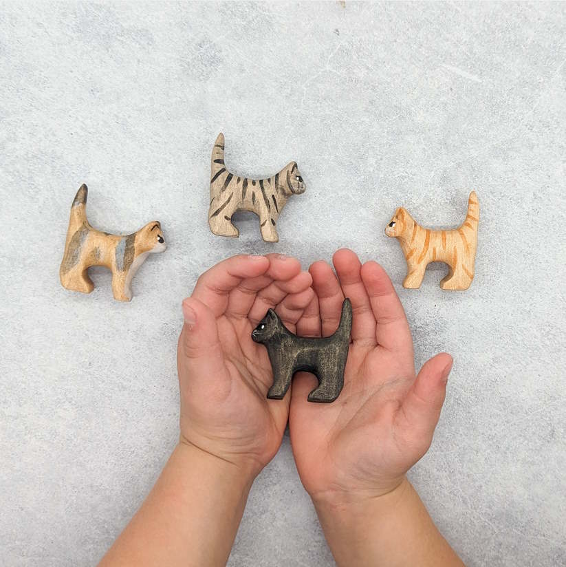The NOM Handcrafted Kitten is ready to play! She holds her tail high and happy and her gentle face has a curious expression. Choose from Black, Calico, Ginger, and Tabby.