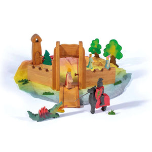 The Ostheimer Kinderkram Drawbridge Gate would make for a beautiful hero piece in any Castle scene. Standing tall at 33cm high, it has a crank on the side that allows your child to lower and lift the drawbridge, to let friends inside and keep foes out! The Ostheimer Drawbridge Gate is made of solid alder wood and finished with natural oils.