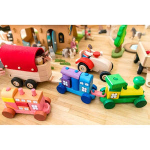 The Ostheimer Kinderkram Train has been carefully handpainted in rainbow colours, with extra detail to depict windows. It comprises three connecting wheelbases in shades of green, pink/orange, and blue, stacked with blocks to form the carriages.