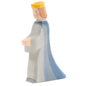 Truly regal, the Ostheimer Queen wears a long flowing robe in light to medium blue and a golden crown on her head.