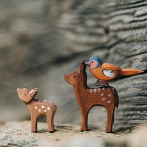 The most beautiful little wooden fawn. The handcrafted Deer Small Head High by Ostheimer is equally happy sitting as a gorgeous wooden ornament on a shelf as it is being played with by little hands. He has such an expressive face as he gazes upwards, and his back features a smattering of sweet white spots.