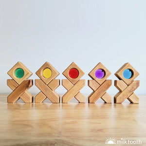 Love these x blocks! Once again the Bauspiel quality does not disappoint. They are a good size, chunky, have a ‘grippiness’ to the wood that helps for stacking and building. They feel durable and I know they’ll last. I purchased a partial set which was easy on the pocketbook- I love that Milktooth offers this option. I added a set of lucite blocks and feel that together they are an amazing addition to the toy shelf.