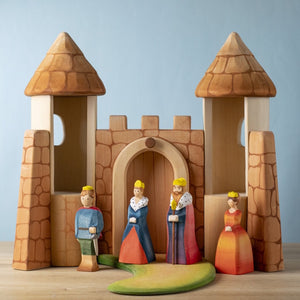 The Bumbu Toys King is adorned in wonderful red, blue, and purple robes with a fur collar. He is wise and gracious, and rules over his kingdom with kindness and justice. A golden crown is perched over his ginger hair and he sports and impressively full beard.
