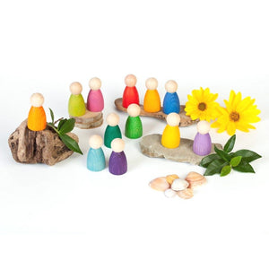 Made from natural timber with water-based colour stain, the twelve Nins feel beautiful in the hand and are fantastic for sensory play. The Nin wooden peg dolls are popularamongst Montessori and Waldorf minded parents, but also amongst parents who simply enjoy beautiful, natural toys that allow for educational, fun play.