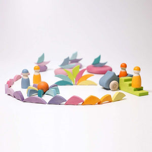 The beautiful Grimm's Spiel Und Holz Pastel Colour Wheel is a set of 36 wooden blocks stained in gorgeous pastel colours. The blocks form the most amazing mandala array.