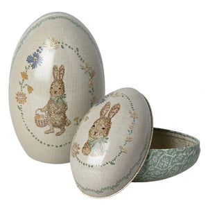 Just think of the sweet Easter treats you could hide inside this set of two eggs! The Maileg Metal Easter Eggs in Green come in a set of two beautifully decorated, hollow eggs, each of which opens up to reveal whatever you've popped inside as a surprise - a Big Sister Mouse in the large egg and a Little Brother Mouse in the small egg, or maybe a little soft chick, a choccie, a wooden bilby toy? Use them as hunting eggs or as a beautiful decorative display. You will receive two eggs, the smaller of which fits inside the larger, both decorated with a print of Dorthe Mailil's personal embroidery. The larger egg has a flat base so it can stand up.