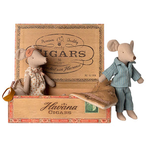 The Maileg Mum and Dad Mice in Cigarbox are all ready for a restful sleep... Let's hope their babies don't wake up! Dressed in a pretty polkadot nightie with bow and handsome stripey blue pyjamas, each parent is wearing a sweet little removable eye mask. Mum Mouse and Dad Mouse sleep with a pillow, blanket, and mattress.