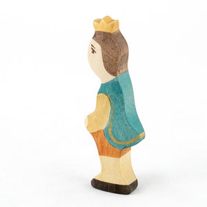 The very handsome Mikheev Prince in Teal and Cream wooden toy is dressed in a cream shirt covered by a royal cape of rich teal with gold trim, along with shorts in a rusty brown. A metallic golden crown sits on top of his brown hair. Our Prince stands at 11cm tall and is a wonderful size to pair with Milk Tooth's Drewart Castles, Prisons, Witch's Houses, and more, as well as our Bauspiel Castles.