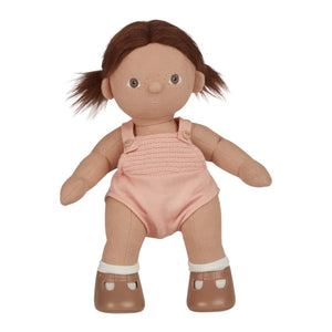 It's not just Dottie’s soft and snuggly body that make her the perfect doll-mate. With her cosy cotton body and soft brown hair, she’s simply made for cuddles. Snuggly, sweet, and always ready for fun, Dottie is dressed to charm in a pink romper with teeny wooden buttons and easy velcro fastenings for little hands. Whether it’s a nap, a tea party, or a grand adventure, Dottie’s ready to tag along and be your little one’s forever friend.