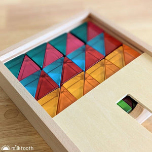 Papoose Small Lucite Triangles are little isosceles triangle blocks in eight different jewel bright colours. You'll receive four of each colour. Simply beautiful and satisfying to play with - children will love to stack them, create mandala patterns, and form squares, rectangles, and other shapes.