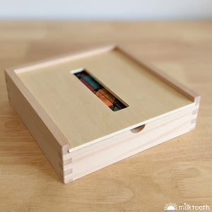 The 32 Papoose Triangles come with their own wooden storage tray with a sliding lid. Pigmentation of Triangles might vary slightly between batches. Some of our photographs include regular-sized Bauspiel Lucite Cubes so you can compare the sizes; these are not included as part of this product listing.