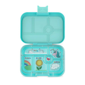 This is our gorgeous turquoise blue Yumbox Original in Misty Aqua. This Original style of Yumbox has six compartments and holds approximately 3.25 cups of food, perfect for a toddler, pre-schooler or light-eating adult.