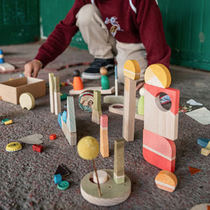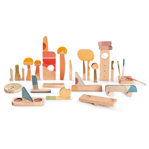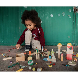 • 40 wooden pieces, including both regular and organic shapes that can become house pieces, tree trunks, rollers, mushrooms, wheels, cityscapes, and more
