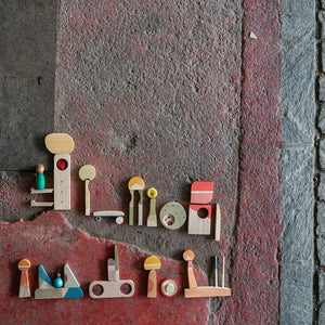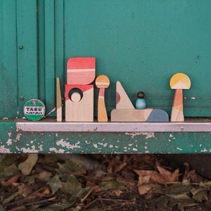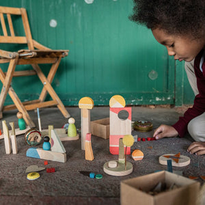 Grapat Happy Place is the perfect set for small world play. Including no less than 40 separate loose parts, Happy Place offers children both organically- and regularly-shaped wooden pieces to create a suburban street, a forest of trees and mushrooms, a city scene, a playground with a seesaw, a day by the lake with a yacht, and more. They might then like to add some Nins, Magos, Tomten, or Palos to their small world scene. Grapat Happy Place can be played with flat on a table or the ground for a 2D play scene, or stood up for a 3D imaginary world.