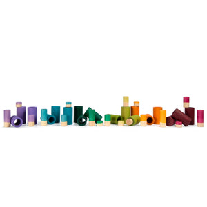 Encourage your child's creative skills and imagination with the gorgeous Grapat La set of 36 jewel-toned loose part wooden toys. By popular demand, Grapat has split the incredible Lola set in half, creating this Grapat La set and the equally beautiful rainbow coloured Grapat Lo set. Your child will have so much fun hiding the little Lola people or bugs in the empty tubes, stacking them on top of each other and the full columns, and threading the empty tubes onto string.