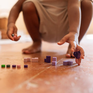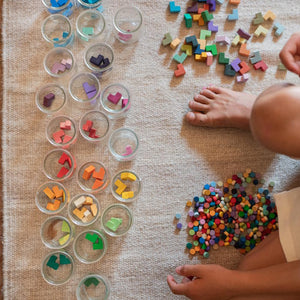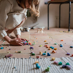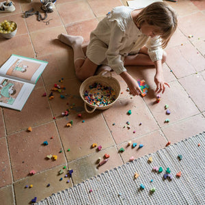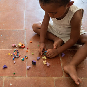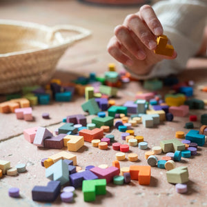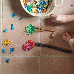 Grapat Mis Match Bloom is a rainbow of gorgeous wooden L-shapes and dots - over 400 of them! Absolutely wonderful for mosaics, learning and sorting colours, art, counting, adding, subtracting, even multiplication and addition, Mis Match Bloom features a beautiful gradient of rainbow colours. Bloom is designed to complement Grapat's Mis and Match set of coloured cubes.