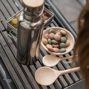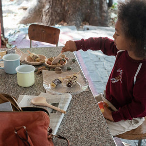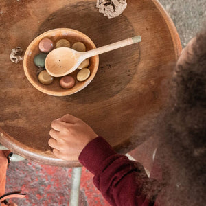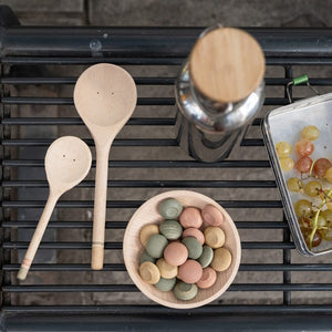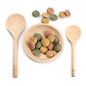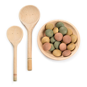 Grapat Yummy is a wonderful toy set for pretend play, particularly around serving, eating, and sharing a meal with family. Children will delight in using the two different wooden spoons to serve their friends and family the yummy little pink, green, and yellow pieces of pretend food onto the included timber plate.